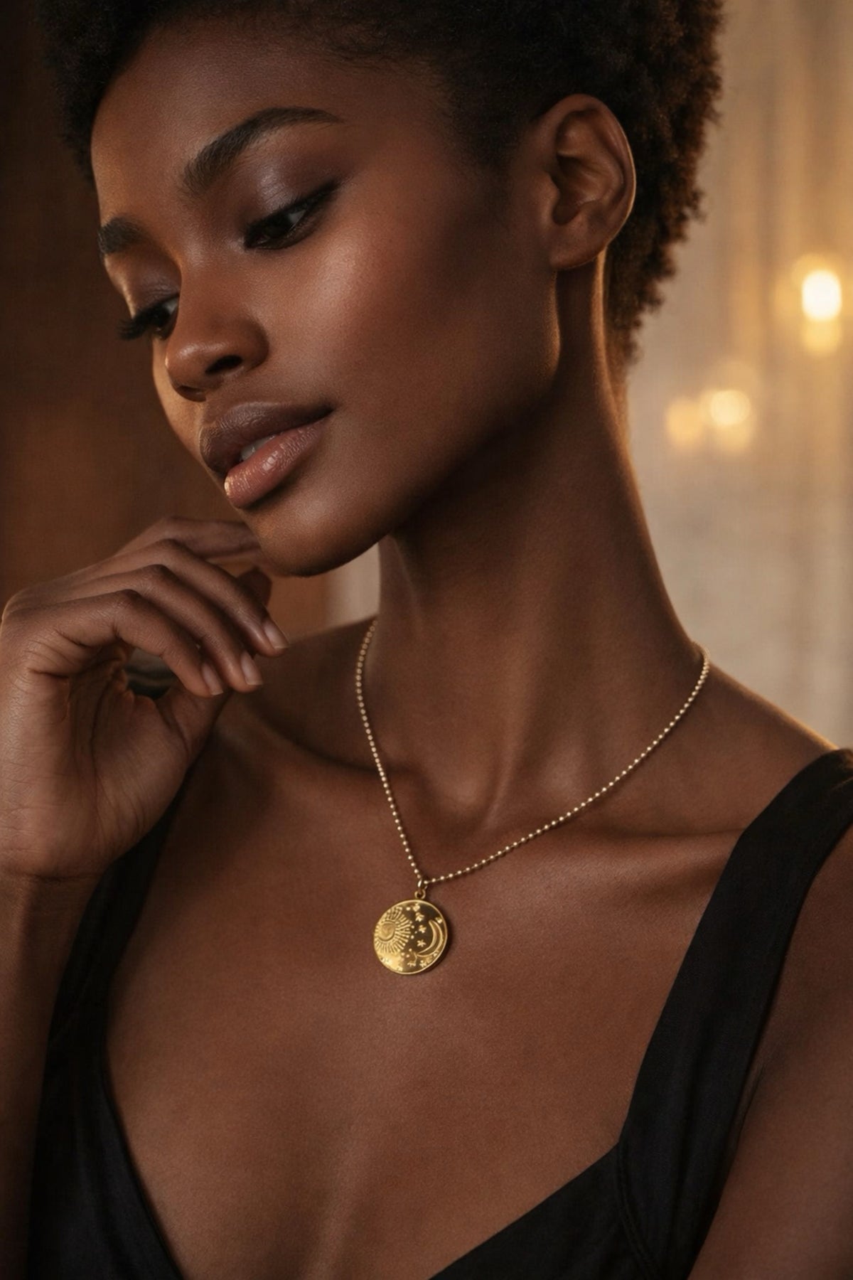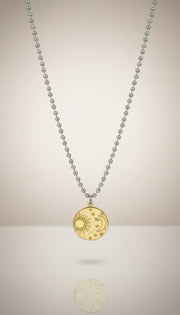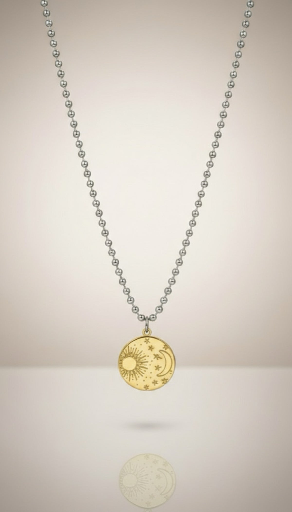 A delicate silver beaded chain featuring a detailed sun and star medallion pendant. Designed to reflect light beautifully, this timeless piece symbolizes balance, warmth, and guidance. Perfect for layering or wearing alone as a subtle statement.