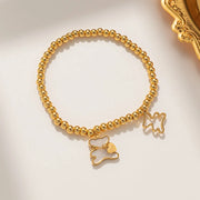 Playful yet elegant, this 18k gold-plated beaded bracelet is designed with two adorable teddy bear charms – one with glossy white enamel and a tiny heart detail, and the other a sleek gold outline. Strung on polished gold beads, it’s lightweight, comfortable, and perfect for stacking or wearing solo.