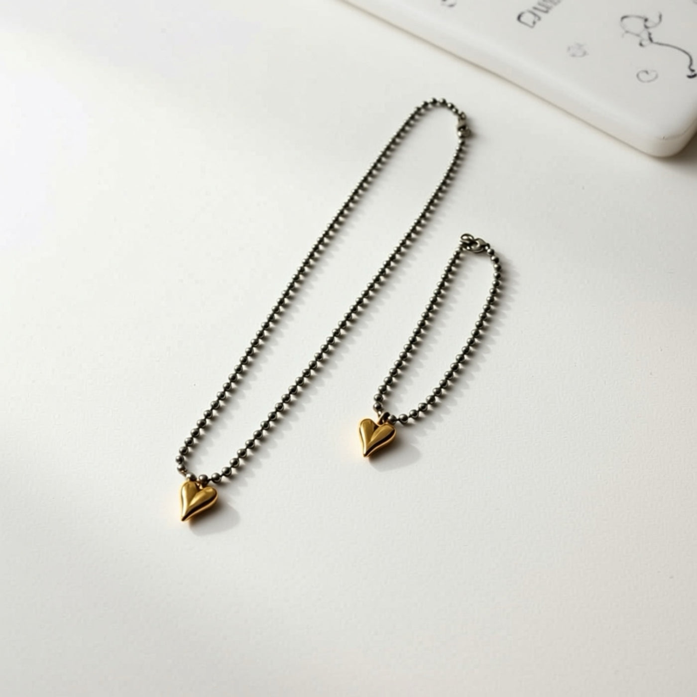 The Golden Heart Duo Set features a modern silver stainless steel bead chain paired with a beautifully polished gold heart charm. Designed to be worn together or separately, this matching necklace and bracelet set blends cool silver tones with warm gold for the perfect mixed-metal look.
